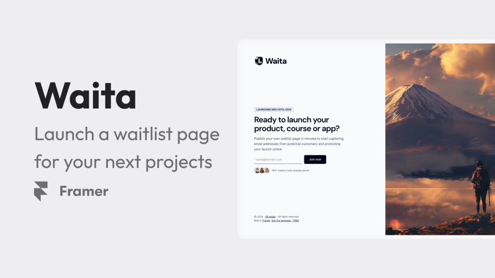 Waita is a modern Framer website template to launch a waitlist page for your upcoming project in minutes. Pick a design from 5 options, add your own content and hit publish.